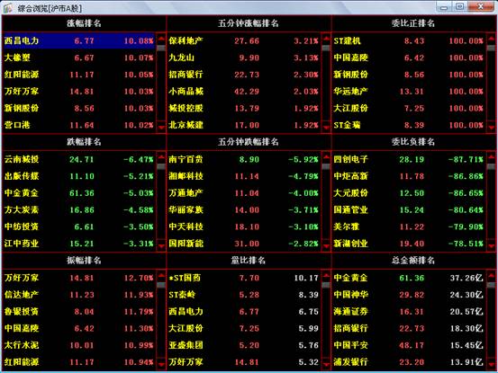 综合排名榜为用户提供了涨跌幅排名、五分钟涨跌幅排名、委比排名、振幅排名、量比排名、总金额排名等相关信息,这些根据各项常用指标排序的结果在一个界面上进行综合呈现。
