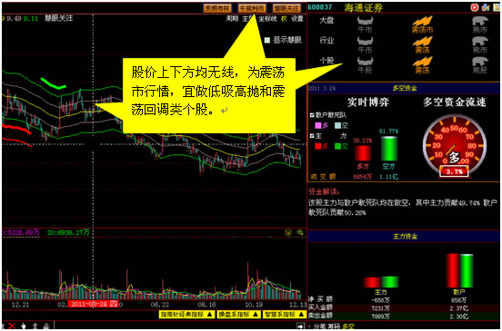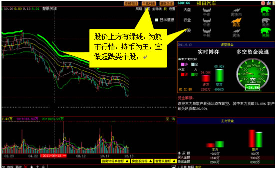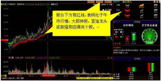 股价下方有支撑线(红线),表明大盘或个股处于牛市行情,大胆持股,宜追龙头或做强势回调类个股;股价上方有阻力线(绿线),为熊市行情,持币为主,宜做超跌类个股;股价上下方均无线,为震荡市行情,宜做低吸高抛和震荡回调类个股。
