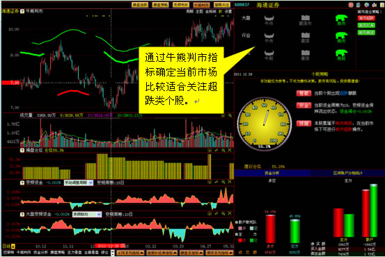 使用牛熊判市功能,判定当前的市场环境及适合关注的股票。在牛市的环境中适合关注追涨股、强势回调股,在震荡市的环境中适合关注高抛低吸、震荡回调的股票;在熊市的环境中合适关注超跌股。