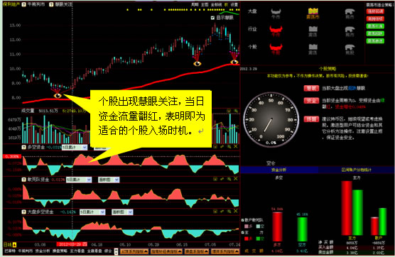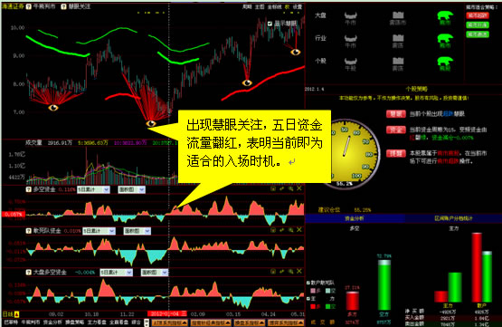 确定当前的时候环境之后,就要选定适合的入场时机,当出现慧眼关注提示及五日资金翻红即为适合的入场时机。