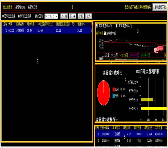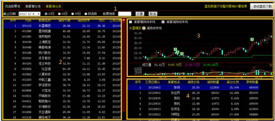 区域3:选中的某只股票的k线图在此显示,可以叠加高管交易榜股票的增持成本线和减持成本线。