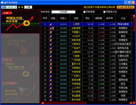 突破通道,突破阻力位,代表股票开始走强,盘中实时监控,把这类股票监控出来,以满足用户做强势股的需求。