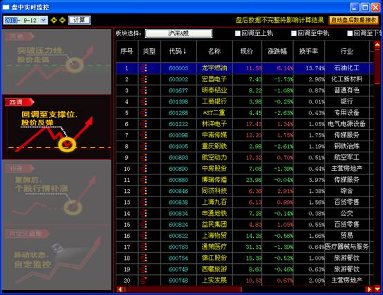 股票走强一段之后,就有回调的需求,据统计,当个股回调至通道的通道的上轨,中轨,下轨,就有很大的几率反转,继续之前的走势,盘中实时监控,将这部分股票,监控出来,满足用户做回调股的需求。