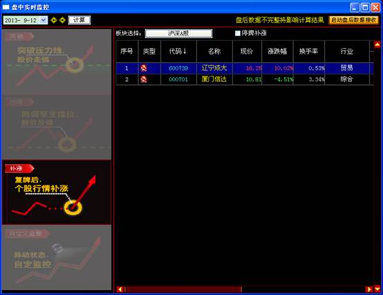 盘中实时监控为对市场股票的总体监控,监控又分为,突破监控、回调监控、补涨监控、自定监控,从不同的角度,对全市场进行监控。