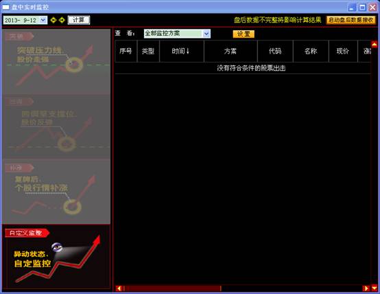 盘中实时监控分为:突破监控;回调监控;补涨监控;自定义监控