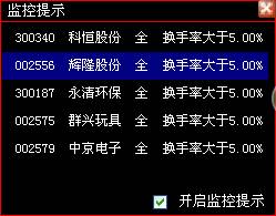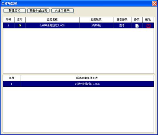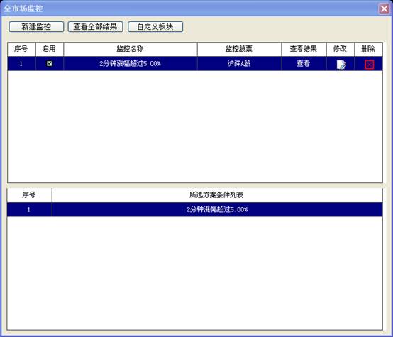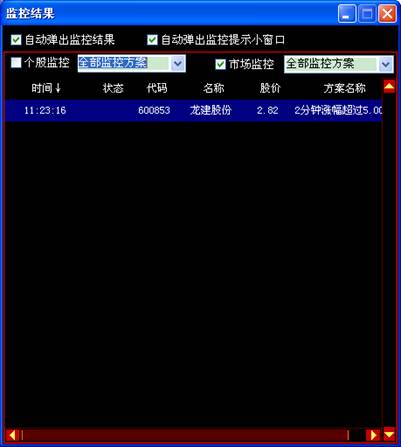 所有的监控结果在这个界面查看,这个界面是监控结果的记录,显示在什么时候,某只股票满足什么监控条件。在监控启动的情况下,符合监控条件的股票,都可以在这里找到。