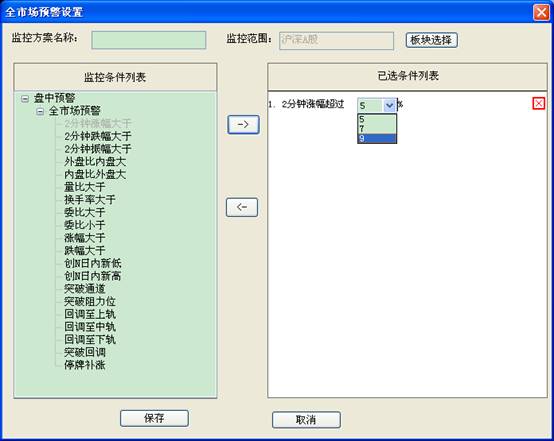 在监控范围选择,要监控的股票范围,系统默认监控沪深A股。
