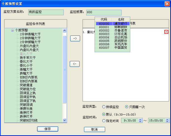 在本界面,对个股监控方案进行设置。