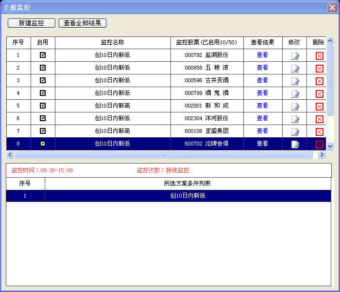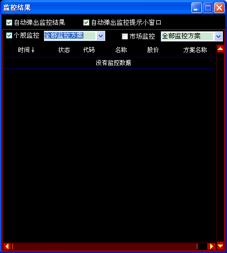 所有的监控结果在这个界面查看,这个界面是监控结果的记录,显示在什么时候,某只股票满足什么监控条件。在监控启动的情况下,符合监控条件的股票,都可以在这里找到。