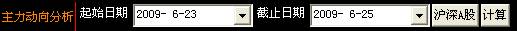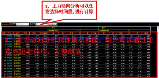 在主力动向分析的整体界面的最上方一栏是时间选择功能。用户可以根据个人需求,选择任意时间段,并点击计算钮。下方展示界面就会显示相应内容。见下图所示。