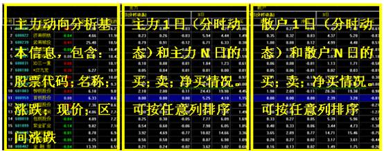显示信息包含:序号;代码;名称;涨跌;现价;区间涨跌;主力1日买;主力1日卖;主力1日净买;主力N日买;主力N日卖;主力N日净买;散户1日买;散户1日卖;散户1日净买;散户N日买;散户N日卖;散户N日净买。用户可以根据个人需求,按任意列排序,进行浏览。详见下图所示。
