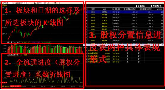 股权分置进度功能给用户展示了某时间段或者时间点限售股解禁的情况,由三个部分组成:第一部分是板块和日期的选择及K线图;第二部分是左下方的全流通进度系数折线图;第三部分是右侧的股权分置进度信息表。如图2: