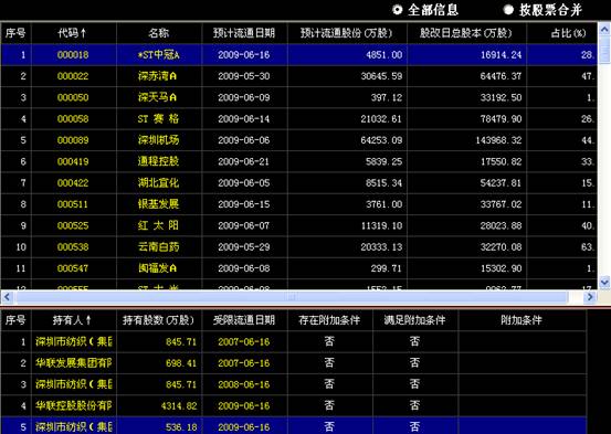●单击某只个股,在右下方窗口显示该股票所有解禁情况,显示:持有人;持有股数;受限流通日期;是否存在附加条件;是否满足附加条件;附加条件内容。如图6: