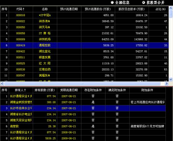 ●右上方窗口选择【全部信息】,显示:股票代码;股票名称;预计流通日期;预计流通股份;股改日总股本;占比(流通股份占总股本的比例)。用户可以根据自己需求,按任意列排序进行浏览。