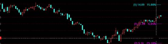 显示的内容:绿色线代表现价之上的阻力位,依次表示从低到高的阻力位。粉色线代表现价之下的支撑位,依次表示从高到低的支撑位。比如:绿色的‘ 14.89 15.88%’ 表示现价之下的阻力位是14.89元,当前价上涨15.88%即碰到阻力线.