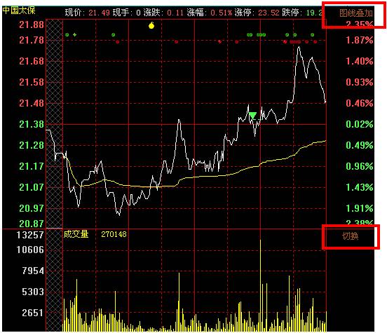 窗口的右上角有两个快捷键,分别是“图线叠加”和“切换”,用于切换图线叠加指标和成交量指标。