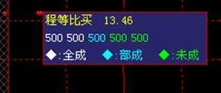 3)程序化单(见下图):程序化单用◇图标显示,红色代表程序化买单,绿色代表程序化卖单。鼠标移至该图标,弹出窗口,内容包括程序化单类型、买入/卖出价格、买卖数量、成交情况(用颜色区分全部成交、部分成交和未成交)。