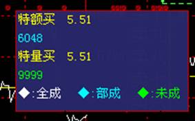 4)特大单(见下图):特大单用○图标显示,红色代表特大买单,绿色代表特大卖单。鼠标移至该图标,弹出窗口,内容包括特大单类型、买入/卖出价格、买卖数量、成交情况(用颜色区分全部成交、部分成交和未成交)。