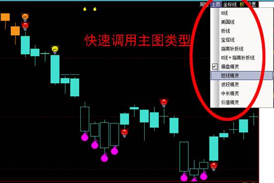 如下图所示,在K线右上角“主图”的选项中,可迅速调用到“操盘精灵、价值精灵、中长精灵、波段精灵、短线精灵”。