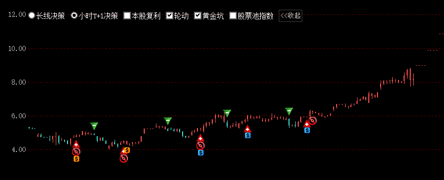 3. 同时长线决策可叠加本股复利、轮动、黄金坑、股票池指数,以及小时开减仓信号。