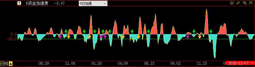 该指标表示资金的变化率情况。当短周期内的变化大于长周期时,表示为正值,反之为负值。更准确的反映资金的流动方向。当动态资金加速度以大角度变化,表示资金大趋势的转变。指标窗中红色面积表示正值,绿色为负值。箭头表示波段操作的加减仓点。黄色箭头表示加仓,绿色表示减仓,粉色箭头表示前期没有涨现在补涨的股票加仓。