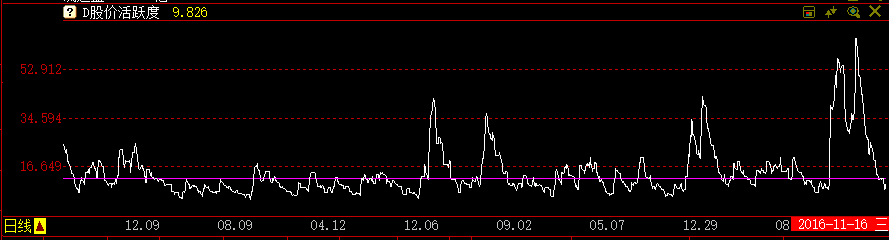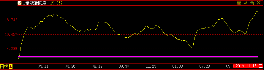 该指标表示股票价格的活跃程度。粉紫线之上表示活跃,值越高越活跃。