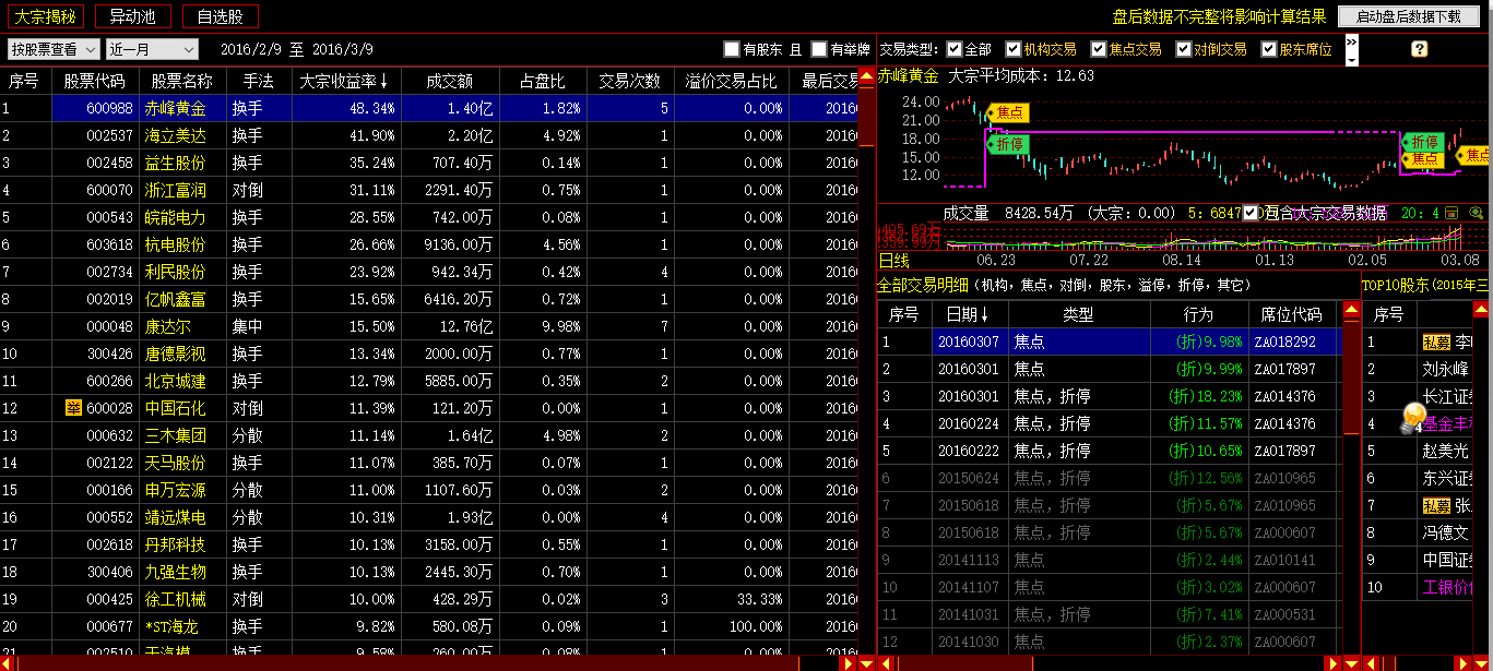当前选中股票同样可通过右侧界面中的K线和列表查看到该股票的大宗交易平均成本、全部交易明细和大股东的参与情况。