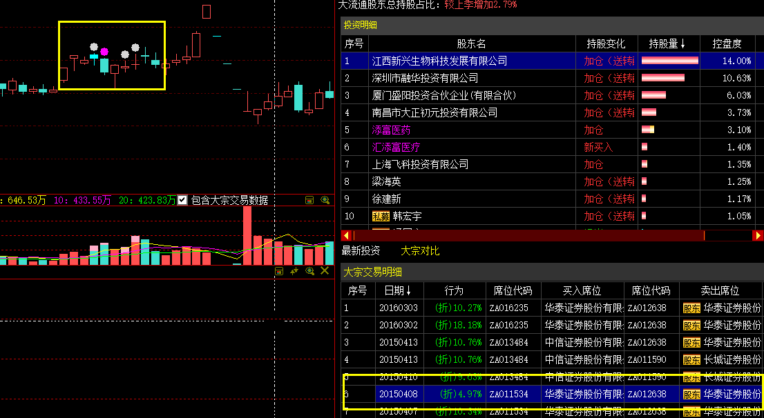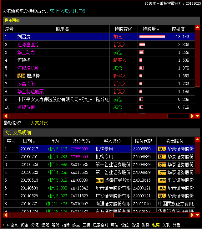 3)个股界面“私募”页签新增大宗对比数据。 对持有非流通A股的股东不计算控盘度数据,客户端显示为—