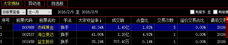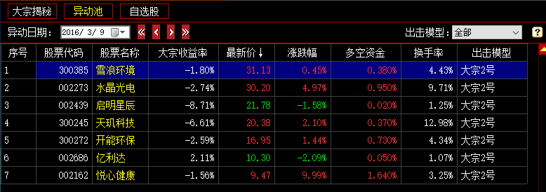 大宗揭秘功能其下有三个功能模块分别为:大宗揭秘、异动池、自选股。以下分别说明。