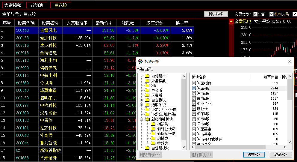 自选股的大宗交易情况。通过“板块选择”可选择查看其它A股市场板块股票大宗交易情况。同样可通过右侧界面中的K线和列表查看到所选股票的大宗交易平均成本、全部交易明细和大股东的参与情况。