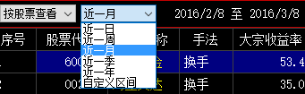 1)左侧界面是大宗交易的股票列表,筛选条件有按股票查看、按席位查看,以及按时间周期筛选。