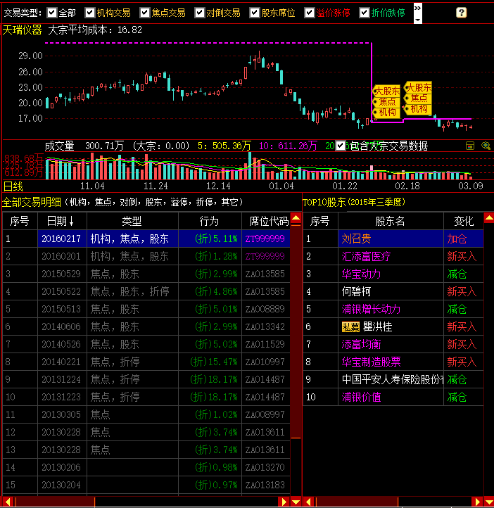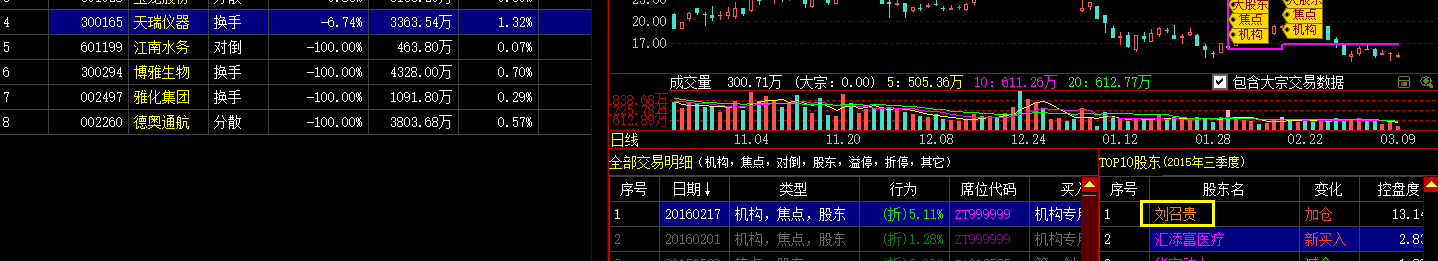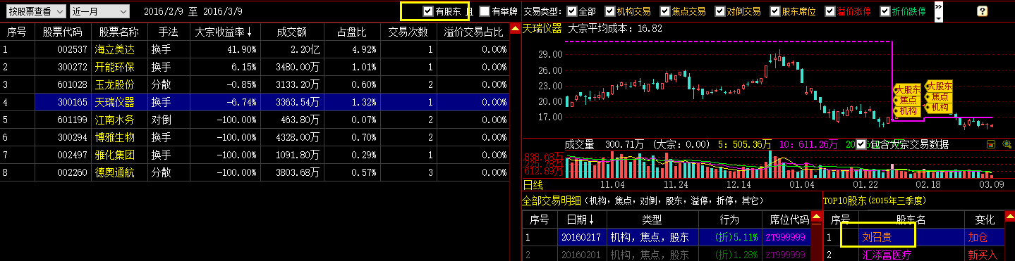 股东列表中可以看到股东的属性,如私募、阳光私募、举牌股东。股东参与大宗交易的行为也做了标注,举例股票300165的大股东刘召贵分别在2016年2月17日、2016年2月1日、2015年5月29日、2015年5月22日通过股东席位参与大宗交易,他在股东列表中的名称特别标注了橙色。