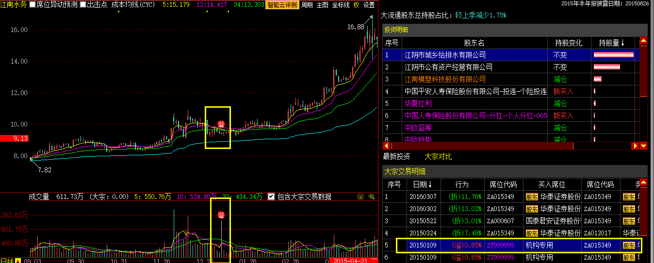 焦点交易。在本股票上非常活跃的大宗席位的交易。