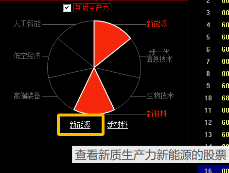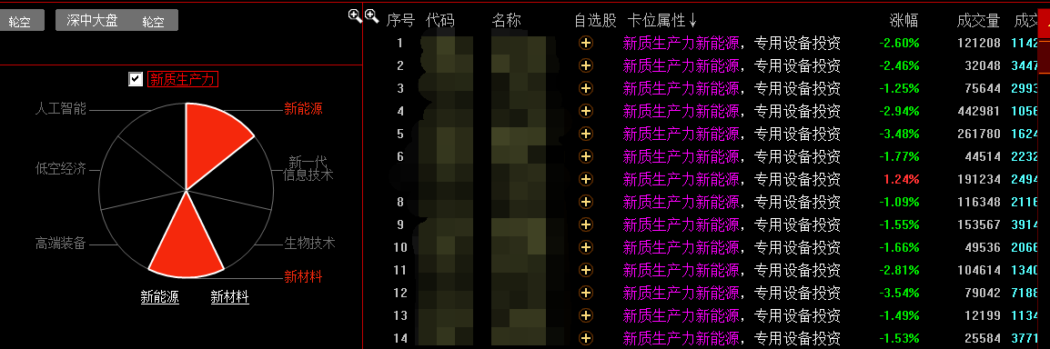 勾选☑新质生产力,下方股票池中显示轮动子类的成分股,即卡位属性为新能源和新材料的股票,粉紫色表示为轮动中的卡位属性。