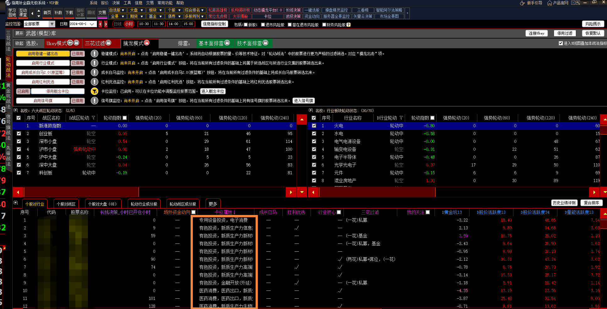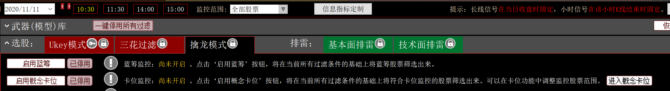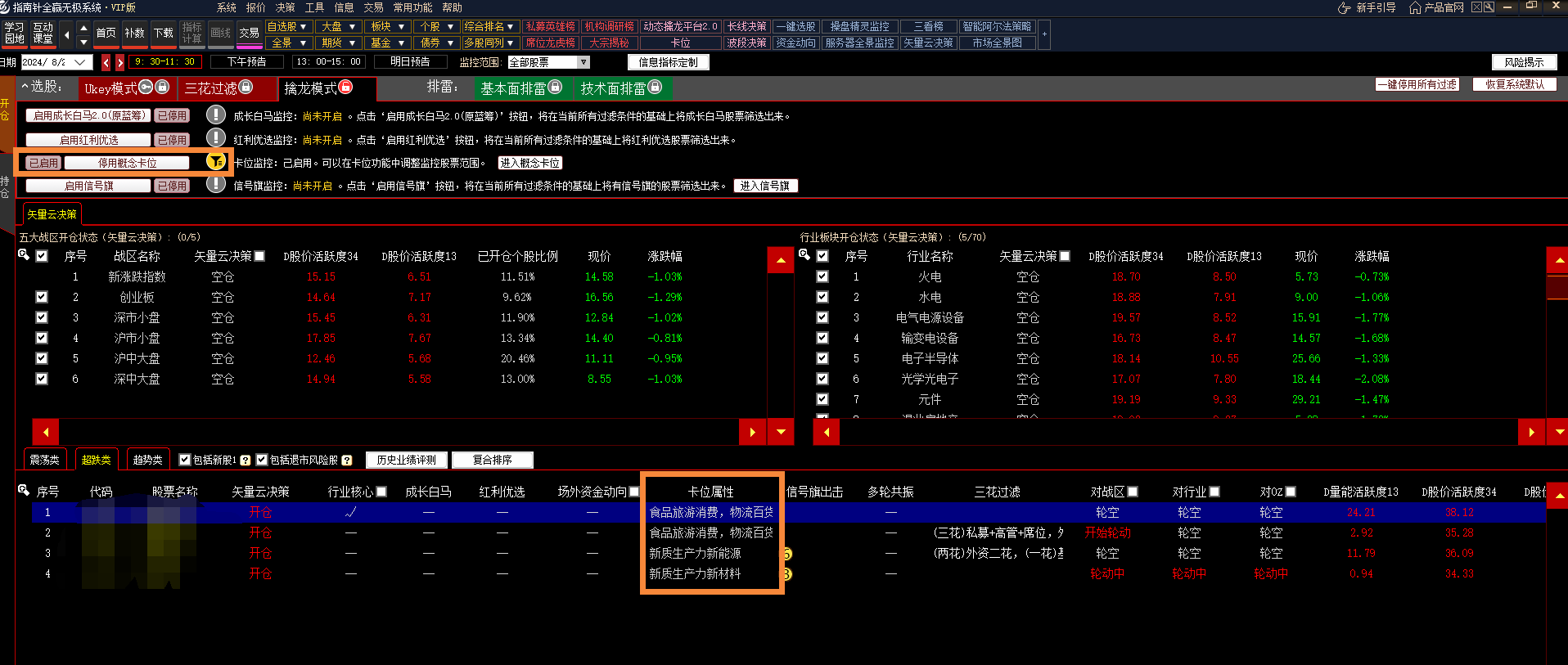 点击“选股 - 擒龙模式 - 启用概念卡位”功能。点击开启,监控卡位出击的股票,将在当前所有过滤条件的基础上将符合卡位监控的股票筛选出来,能在卡位功能中调整监控的概念板块范围。从此处也可以跳转至卡位功能。