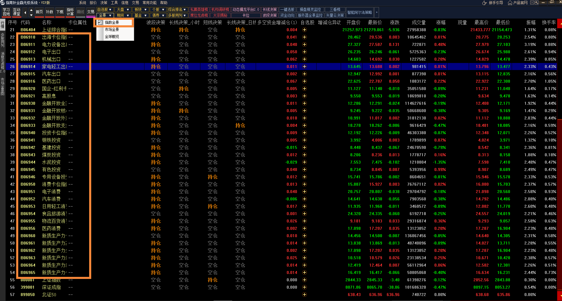 指数全景监控功能含有卡位的六大概念指数及相关行业和层级指数: