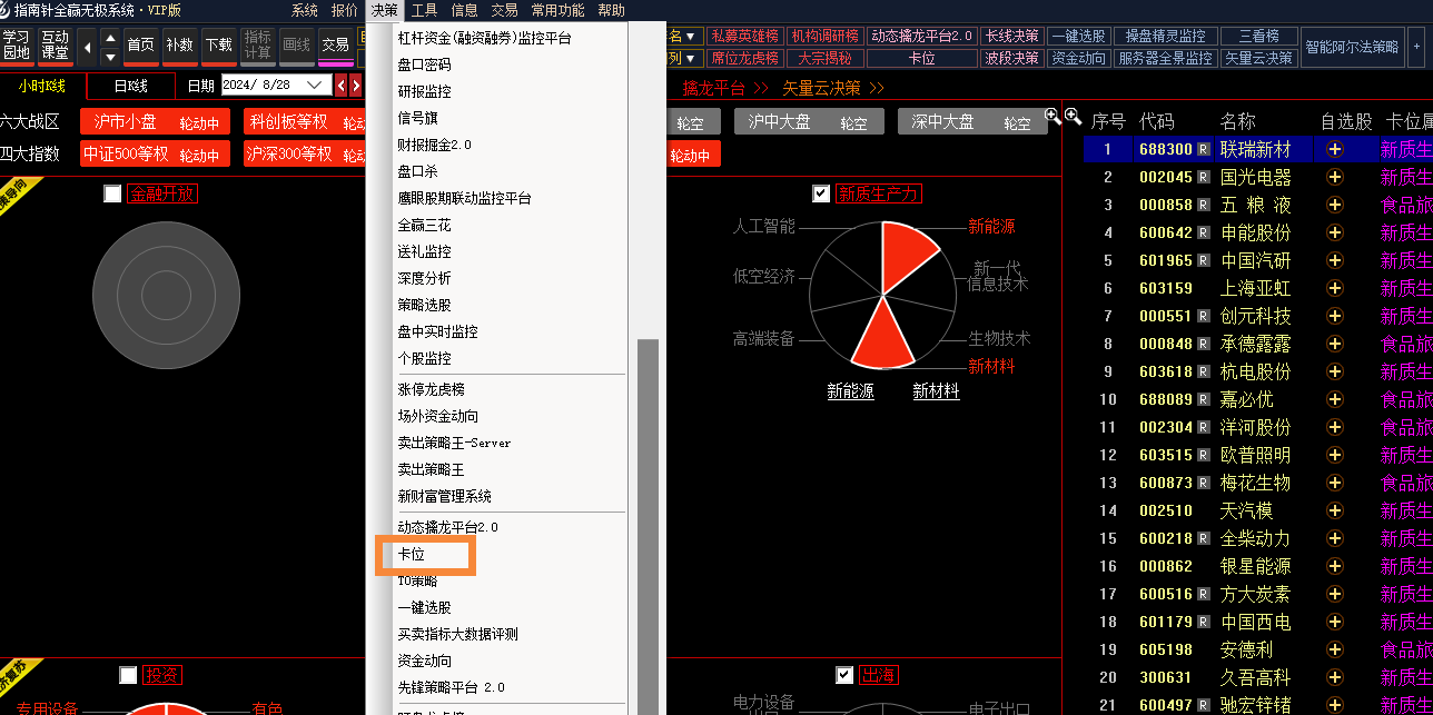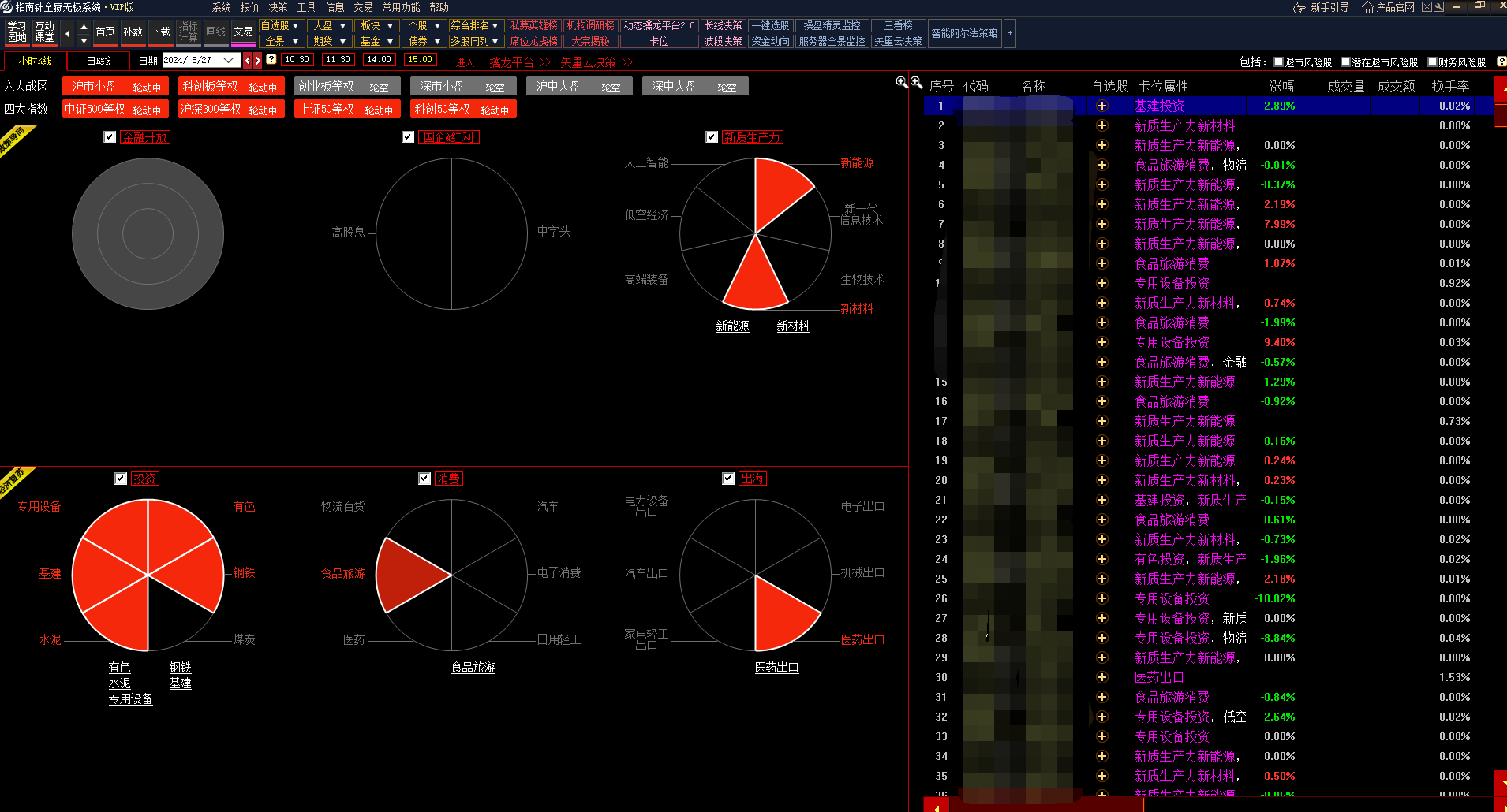 轮动的概念/层级会以文字形式显示在饼图下方,并且勾选概念可以在股票池中看到轮动中的股票。股票池中可以通过鼠标右键等操作对行情报价进行列布局排序、加自选股等操作。