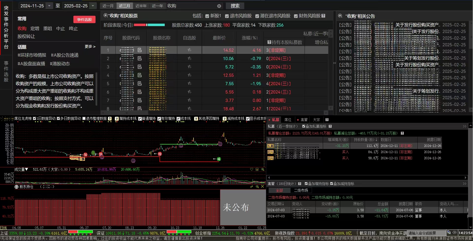 突发事件分析平台是基于交易所公告与网络资讯的股票检索筛选功能。提供关键字相关股票及公告资讯检索,并通过算法提供常用关键字:收购、定增、重组、股权转让的选股策略。