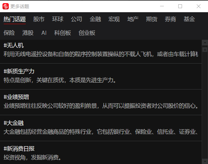 右上方“更多>”按钮可进入“更多话题”弹窗,按照话题分类提供更多话题选择。