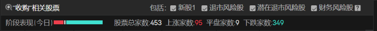 本功能提供常用关键字“收购”“定增”“重组”“股权转让”的股票池勾选,可以任意组合多选,查看该日期股票的出击情况。同时支持 包括新股1、退市风险股、潜在退市风险股、财务风险股的筛选。