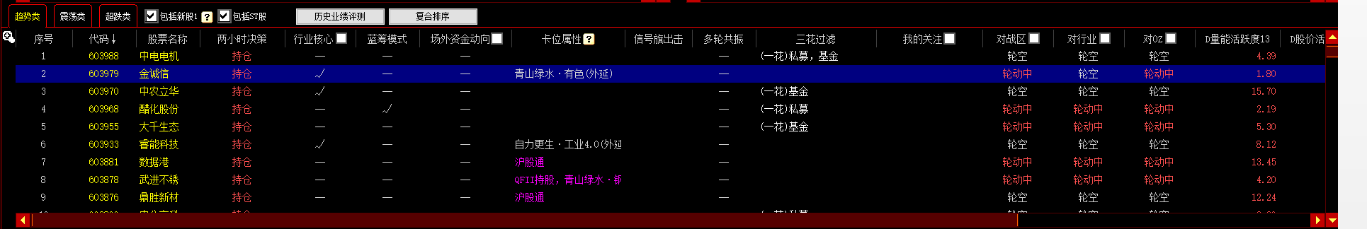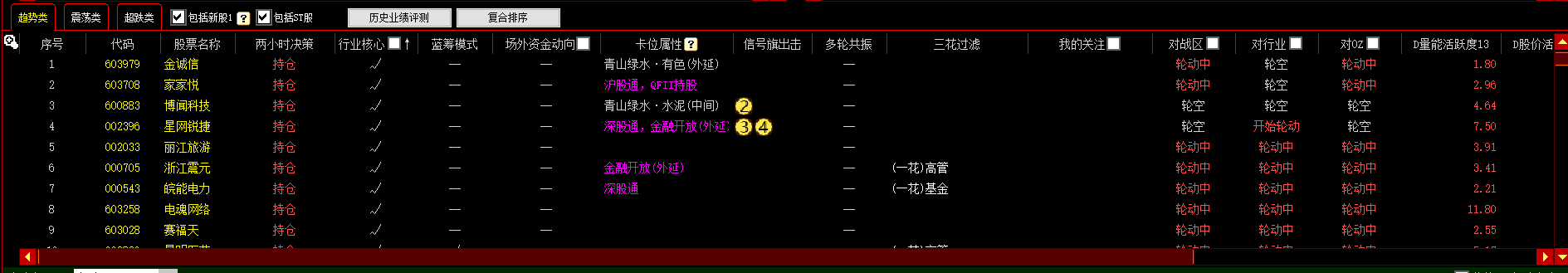 列布局为序号、代码、股票名称、两小时决策、行业核心、蓝筹模式、场外资金动向、卡位属性、信号旗出击、多轮共振、三花过滤、我的关注、对战区、对行业、对OZ、D量能活跃度13、D股价活跃度34、D股价活跃度13、D黄金坑13