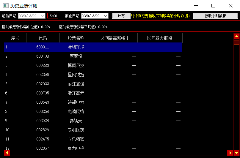 列布局为序号、代码、股票名称、区间最高涨幅、区间最大振幅。