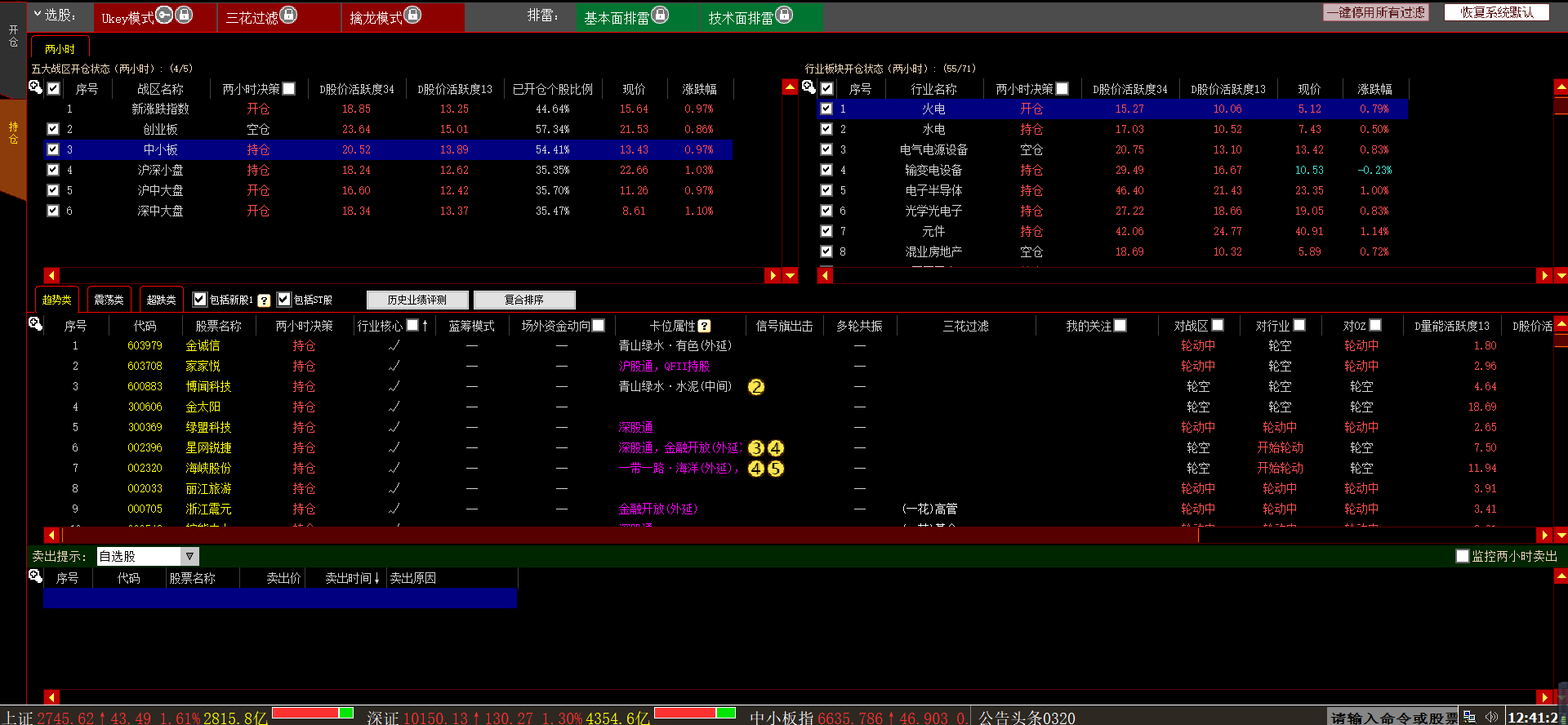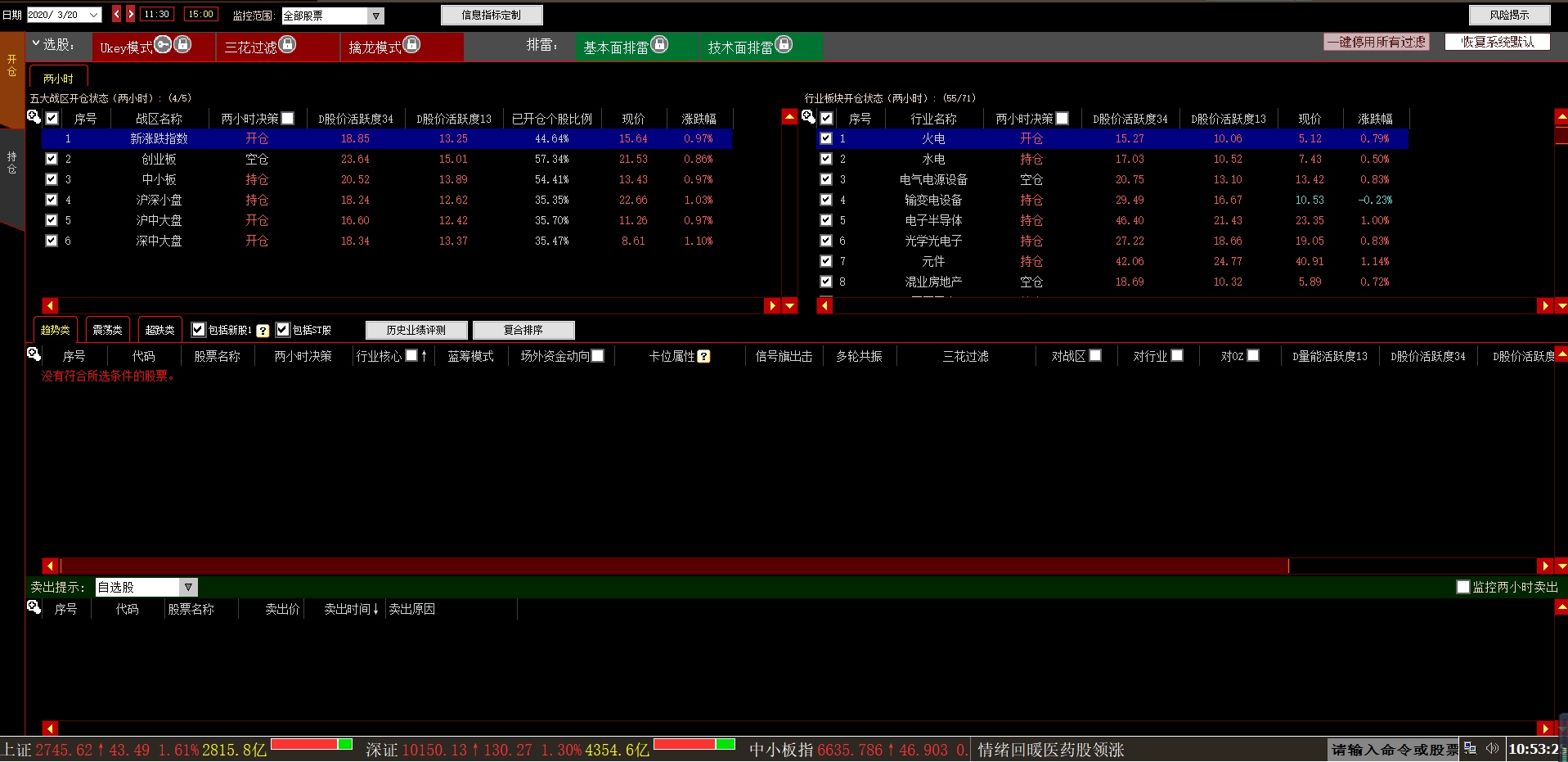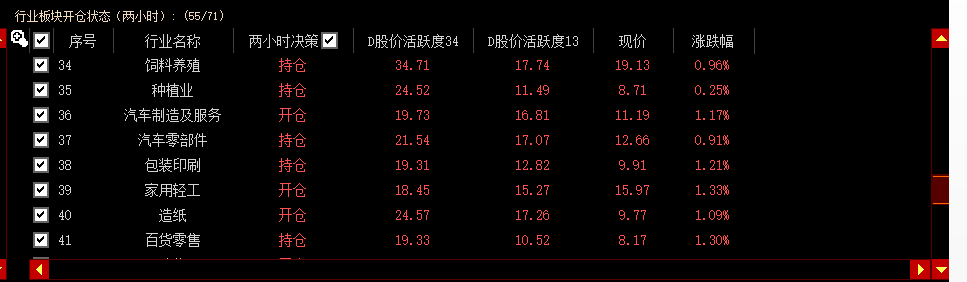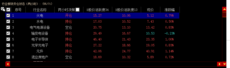 行业板块开仓状态分为开仓、持仓和空仓三种,当勾选两小时决策时,只显示开仓、持仓中的行业板块。