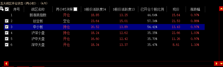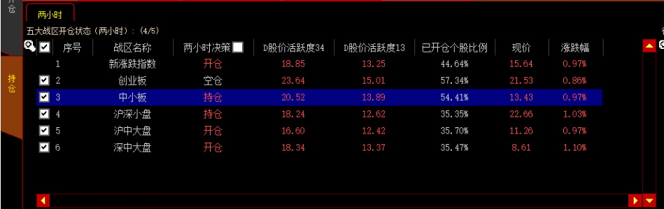 五大战区开仓状态分为开仓、持仓和空仓三种,当勾选两小时决策时,只显示开仓、持仓的战区。