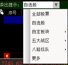 卖出提示:可选全部股票、自选股、自定板块、五大战区、八路纵队、更多(即弹出板块选择界面),最右侧设定监控两小时卖出。