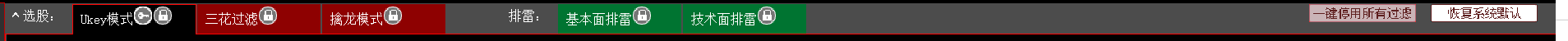 4、开仓和持仓页面上方的选股、排雷;最右侧是一键停用所有过滤、恢复系统默认。
