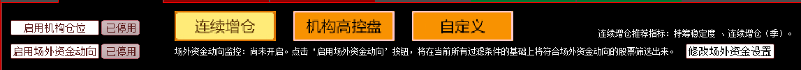 Ukey模式:在Ukey正常连接时,机构仓位、场外资金动向后面图标会显示红色,否则显示灰色表示未连接成功。只有在红色连接成功状态下才能进行机构仓位、场外资金动向过滤。分三种过滤方式:连续增仓、机构高操盘、自定义。