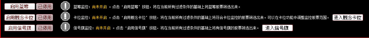点击“启用概念卡位”按钮,将在当前所有过滤条件的基础上将符合卡位监控的股票筛选出来。还可以在卡位功能中调整监控股票范围。