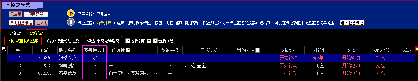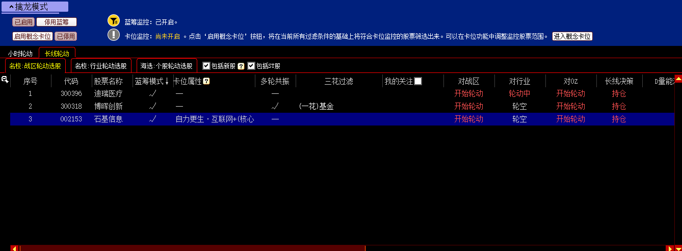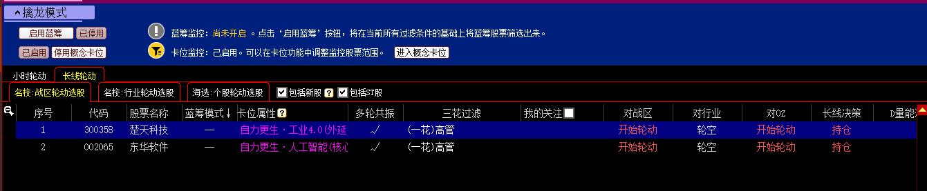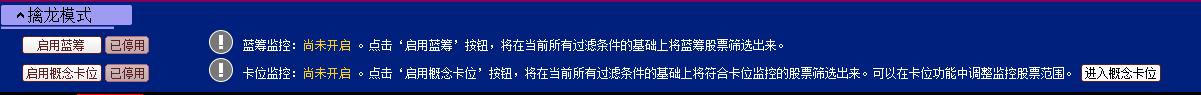 擒龙模式现有2种过滤模型:蓝筹监控、概念卡位监控