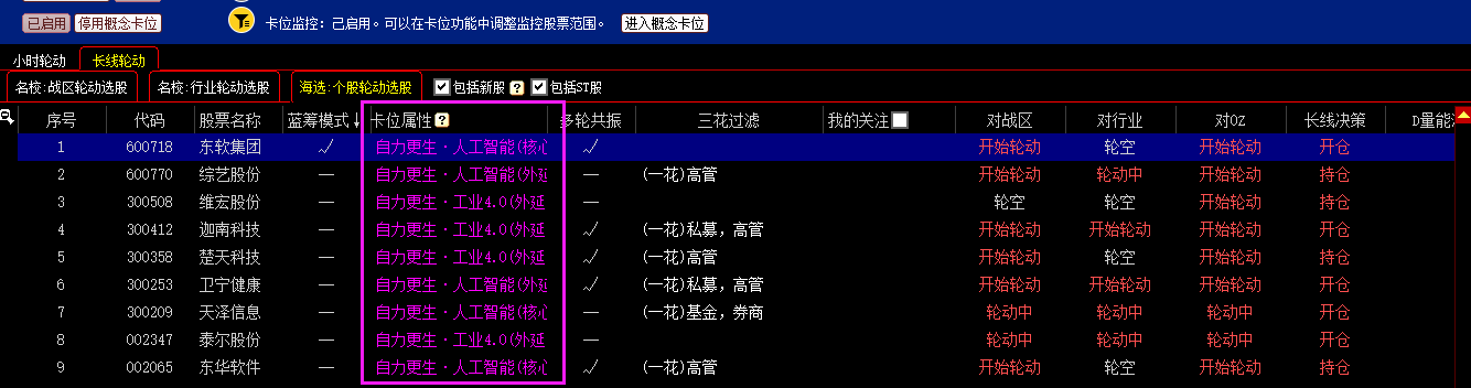 点击“启用概念卡位”按钮,将在当前所有过滤条件的基础上将符合卡位监控的股票筛选出来。还可以在卡位功能中调整监控股票范围。